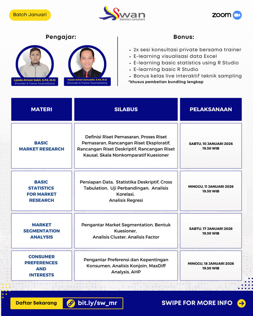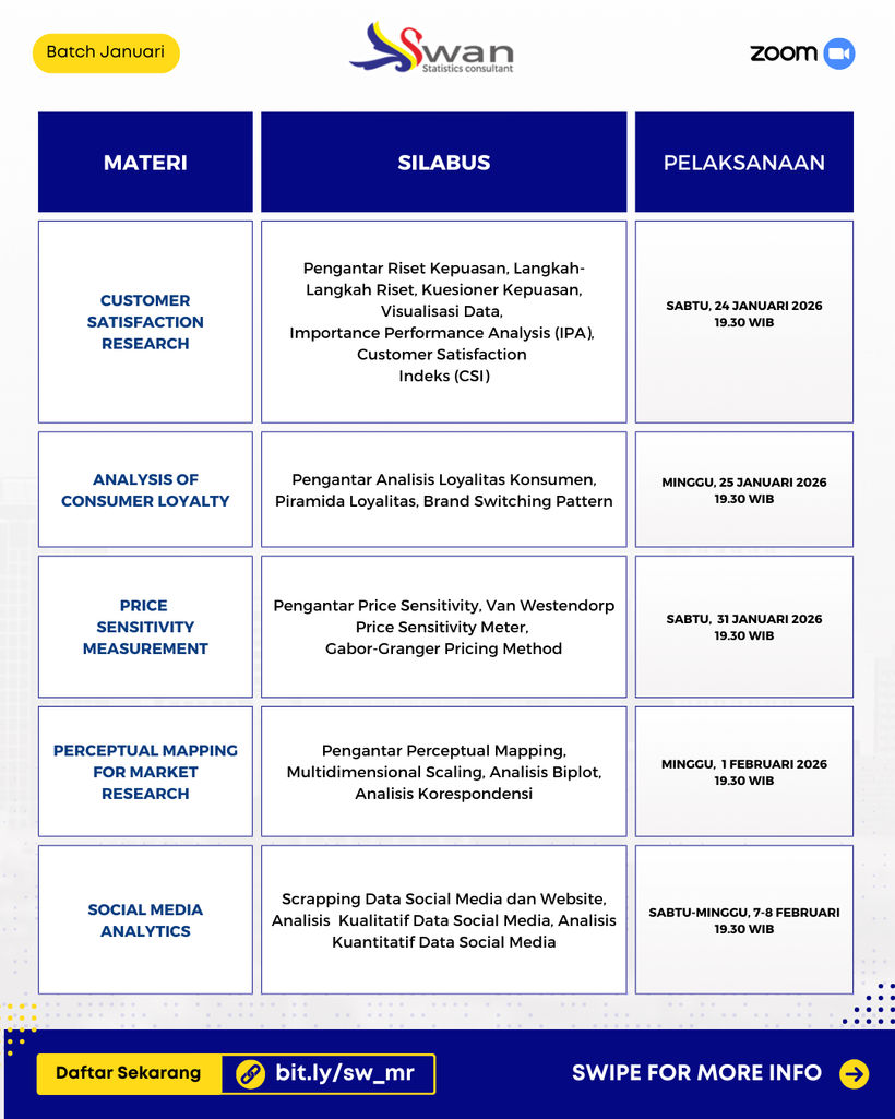 Program bootcamp marketing analysis dari Swan Statistics merupakan program terbaru untuk mendukung dan menciptakan profesional di bidang marketing research analysis. Apakah anda merupakan salah satunya?